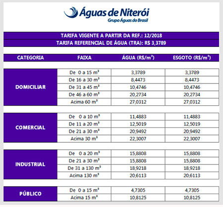 A concessionária Águas de Niterói publicou em seu site a estrutura tarifária que está vigorando até novembro de 2019 (veja na tabela). Os condomínios residenciais são os que pagam mais. Com o reajuste aprovado pela Prefeitura, através da Emusa, o metro cúbico passou a custar R$27,0312 segundo a tabela progressiva para os consumidores domiciliares que gastam acima de 60 mil litros mensais, como acontece com a maioria dos condomínios com mais de 20 moradores.
