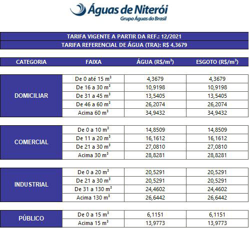 A concessionária Águas de Niterói publicou em seu site a estrutura tarifária que está vigorando até junho de 2022 (veja na tabela). Em julho, a empresa já está autorizada pela prefeitura niteroiense a aplicar novo reajuste, desta vez de 4,14 por cento sobre a tarifa referencial de água de novembro de 2021.
