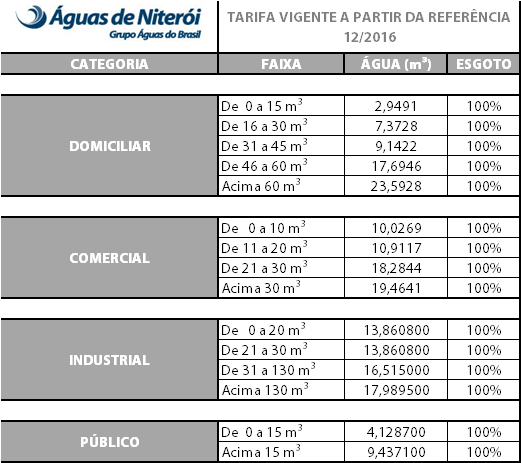 A concessionária Águas de Niterói publicou em seu site a estrutura tarifária em vigor até novembro de 2017 (veja na tabela). Os condomínios residenciais são os que pagam mais. Com o reajuste aprovado pela Prefeitura, através da Emusa, que vigora desde dezembro, o metro cúbico passou a custar R$23,5928 para os consumidores domiciliares que gastam acima de 60 mil litros mensais, como a maioria dos condomínios com mais de 20 moradores.