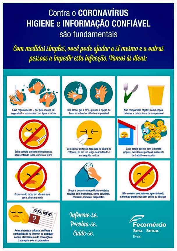 - evitar passar a mão nos olhos, nariz e boca (pois se o vírus estiver em uma superfície, pode transferir para o corpo);