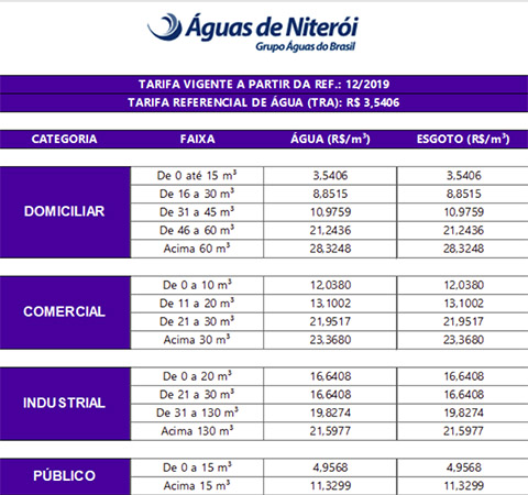 A estrutura tarifária da Águas de Niterói é dividida em cinco faixas de cobrança pelo consumo residencial e quatro para o comercial e para o industrial. As contas dobram de valor porque a concessionária cobra valor igual ao do consumo de água como estimativa de metro cúbico de esgoto despejado na rede da concessionária.