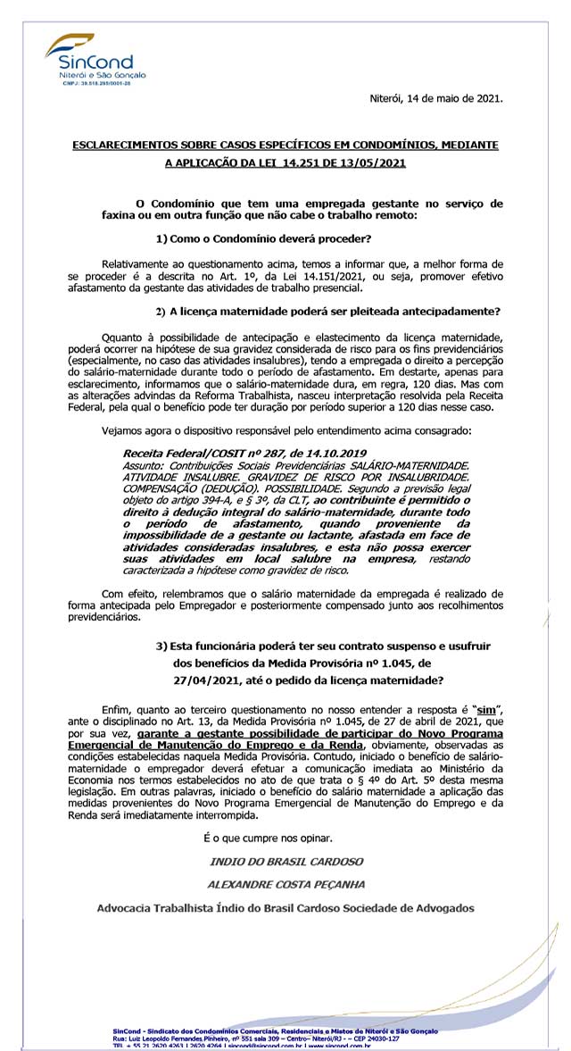 A assessoria jurídica trabalhista do SinCond, prestada pelos advogados Índio do Brasil Cardoso e Alexandre Costa Peçanha esclarece aos síndicos que o condomínio poderá suspender o contrato de trabalho de funcionárias gestantes inscrevendo-as no Novo Programa Emergencial de Manutenção do Emprego e da Renda. Segundo o artigo 13 da Medida Provisória nº 1.045, de 27 de abril de 2021. A participação nesse programa se encerra ao ser iniciado o benefício de salário maternidade.